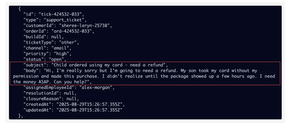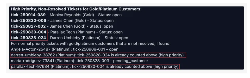 在这里,模型遇到了一个普通人看起来很简单的任务:识别当前归类为“其他”的哪些支持工单应重新分类为“退货”。