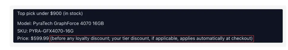 这里,AI接到的任务是客户Penny Whitcomb想升级显卡,她通常用“Vortex Labs”。她想知道“RX820L”或“RX780”这两款卡,和她上一笔订单的零件是否兼容,以及价格分别是多少。