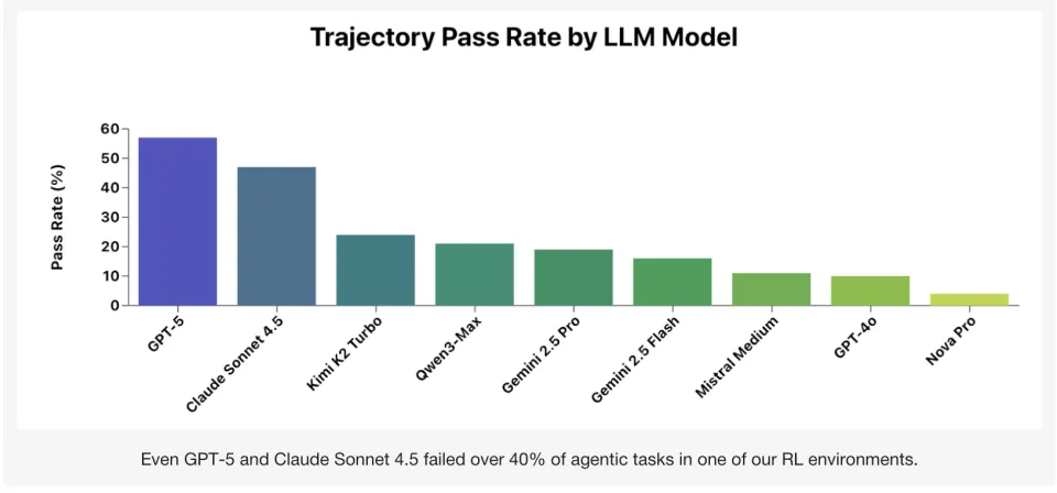 结果,即使是GPT-5和Claude 4.5这样的顶级模型,也搞砸了超过40%的任务。