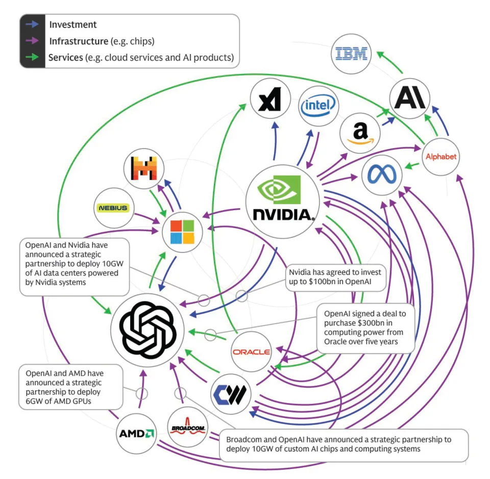 2.美国当前规划建设的大型数据中心项目总装机容量已突破 45 吉瓦(GW),这场建设热潮预计将吸引超 2.5 万亿美元投资。大西洋月刊文章设想了一种“崩盘机制”,即当这些巨额投资未能按预期变现、资本市场情绪转向、防御性抛售开始,就可能触发系统性的回落,科技股回落→估值压缩→投资放缓→AI 基础设施、芯片、数据中心等领域连锁受累。