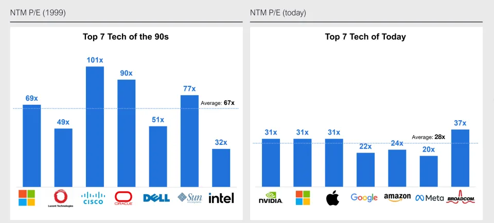 5.历史上,并非所有的长期投资都是泡沫。关于是否是大的泡沫,一方面看其到底是生产性的,还是非生产性的,如荷兰郁金香泡沫就是典型的非生产性泡沫,更容易破裂。另一方面,看钱的来源,是否是产业自有投资,还是大量举债,且是否被包装成各种金融衍生品,通过加杠杆酝酿更大的风险。对比2000年互联网泡沫时大型企业的估值,当前整体上虽然有一定程度的上升,但仍然处于一个相对合理的区间,有较强的业绩支撑保障。