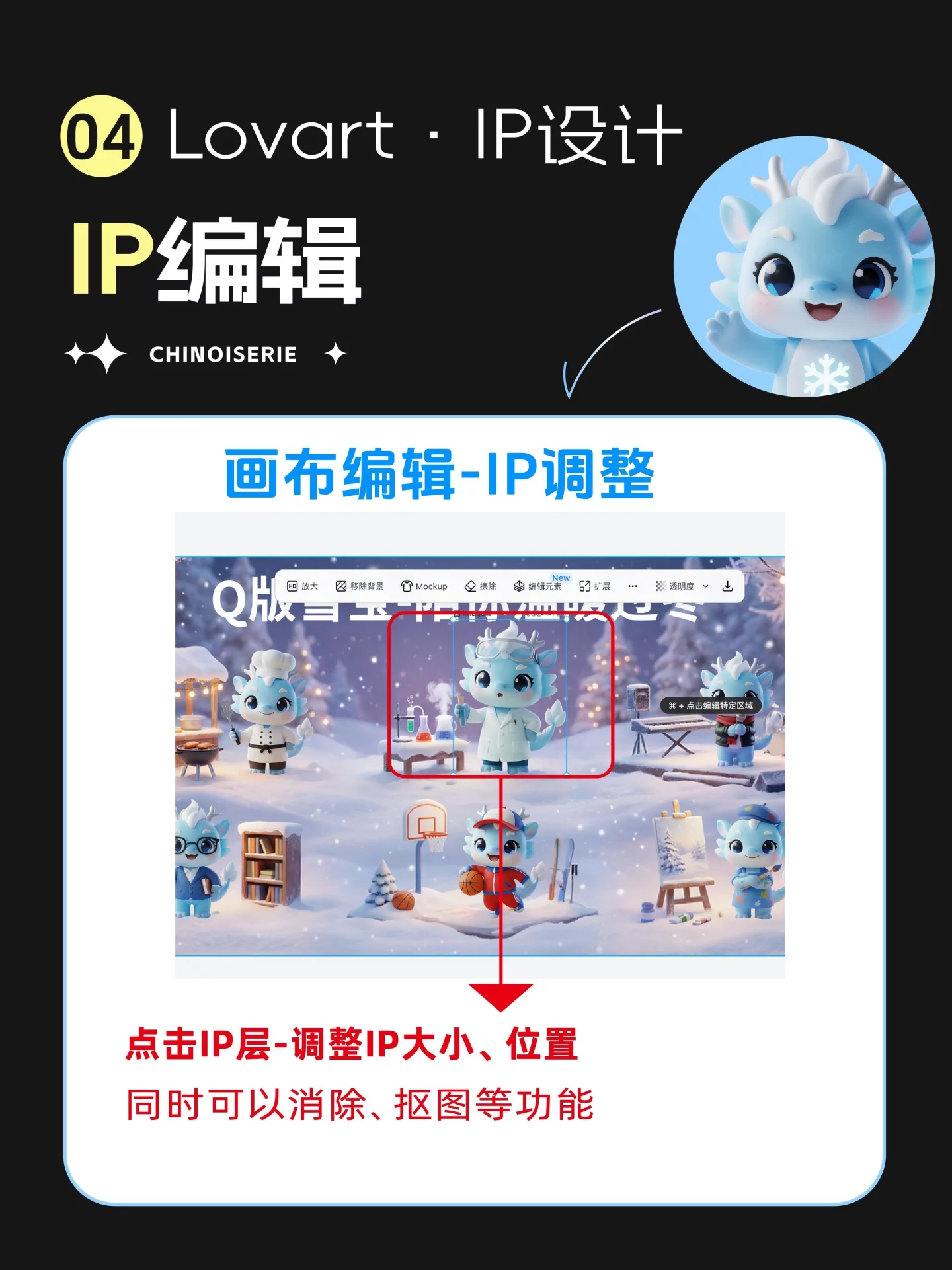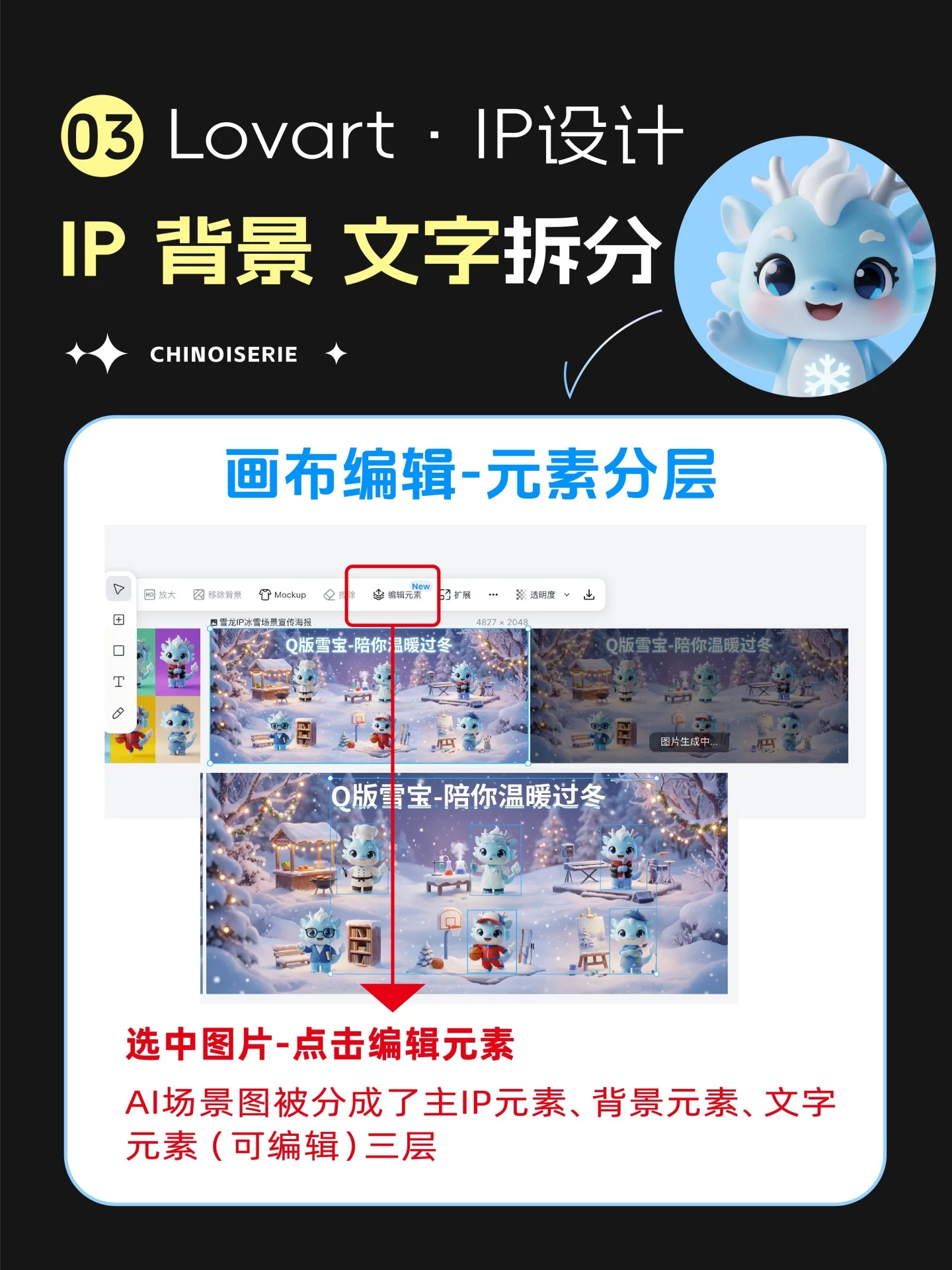 lovart的编辑元素功能把AI场景图拆分成背景层、IP层、文字层,都支持编辑,超方便的!