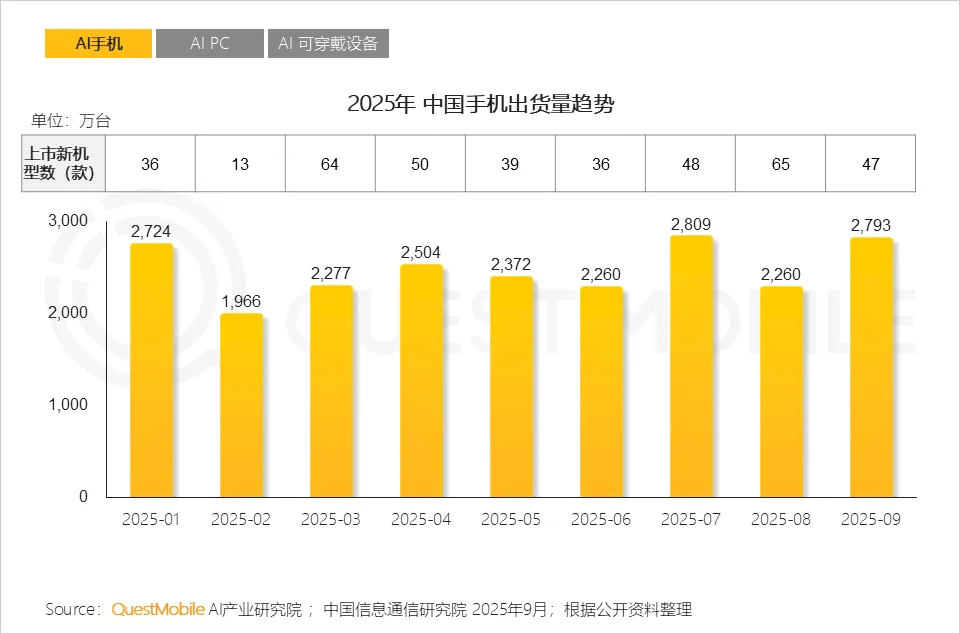 1.1 据公开资料显示,2025年1-9月,国内手机出货量累计达2.2亿台,平均单月出货量在2440万台;AI能力正成为用户换机的核心驱动力,且推动市场进入新一轮增长周期