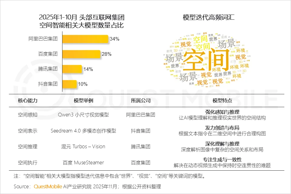 具身智能作为消费级AI应用和工业级AI应用的融合集大成者,吸引了众多创业公司和资本进入,2025年1-10月,行业融资事件达到409起,其中,松延动力Noetix参与融资次数达到5次。当然,未来更值得期待的空间智能将在底层重塑“人机生态”,头部科技大厂已经纷纷悄然入局,1-10月,阿里巴巴集团、百度集团、腾讯集团、抖音集团空间智能相关大模型数量占比分别达到34%、28%、14%、10%。