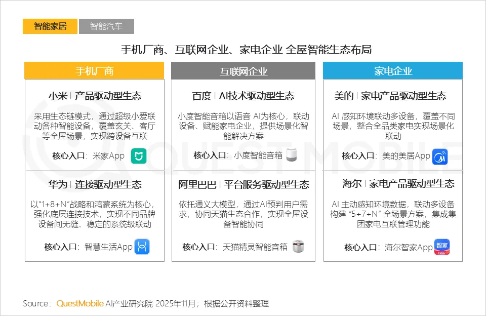 • 智能家居领域,手机厂商具备移动入口和连接优势,互联网企业具备AI技术和平台服务优势,家电企业则在硬件产品和垂直场景有深厚理解。
