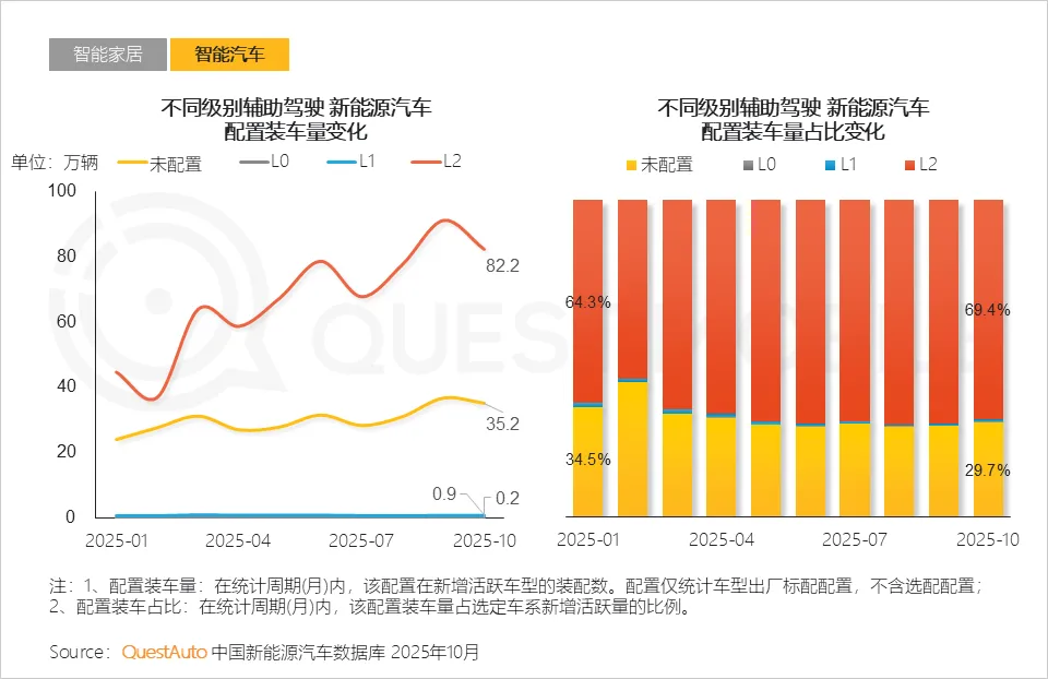 QuestAuto数据显示,2025年10月,具备L2级别辅助驾驶功能的配置装车辆占比69.4%,较1月提升5.1%。