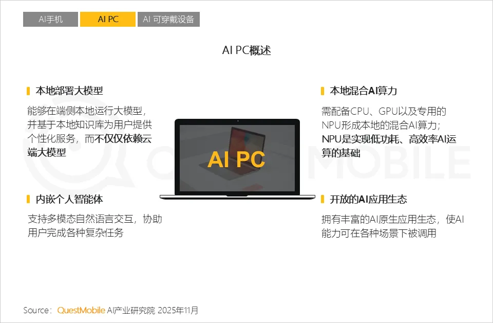 1.3 AI PC的本地混合AI算力是“端-边-云”架构在个人计算场景的成功实践;它不仅是一个终端,更是一个强大的本地算力节点,其背后是国产芯片技术的支撑和“端云协同”的先进设计理念