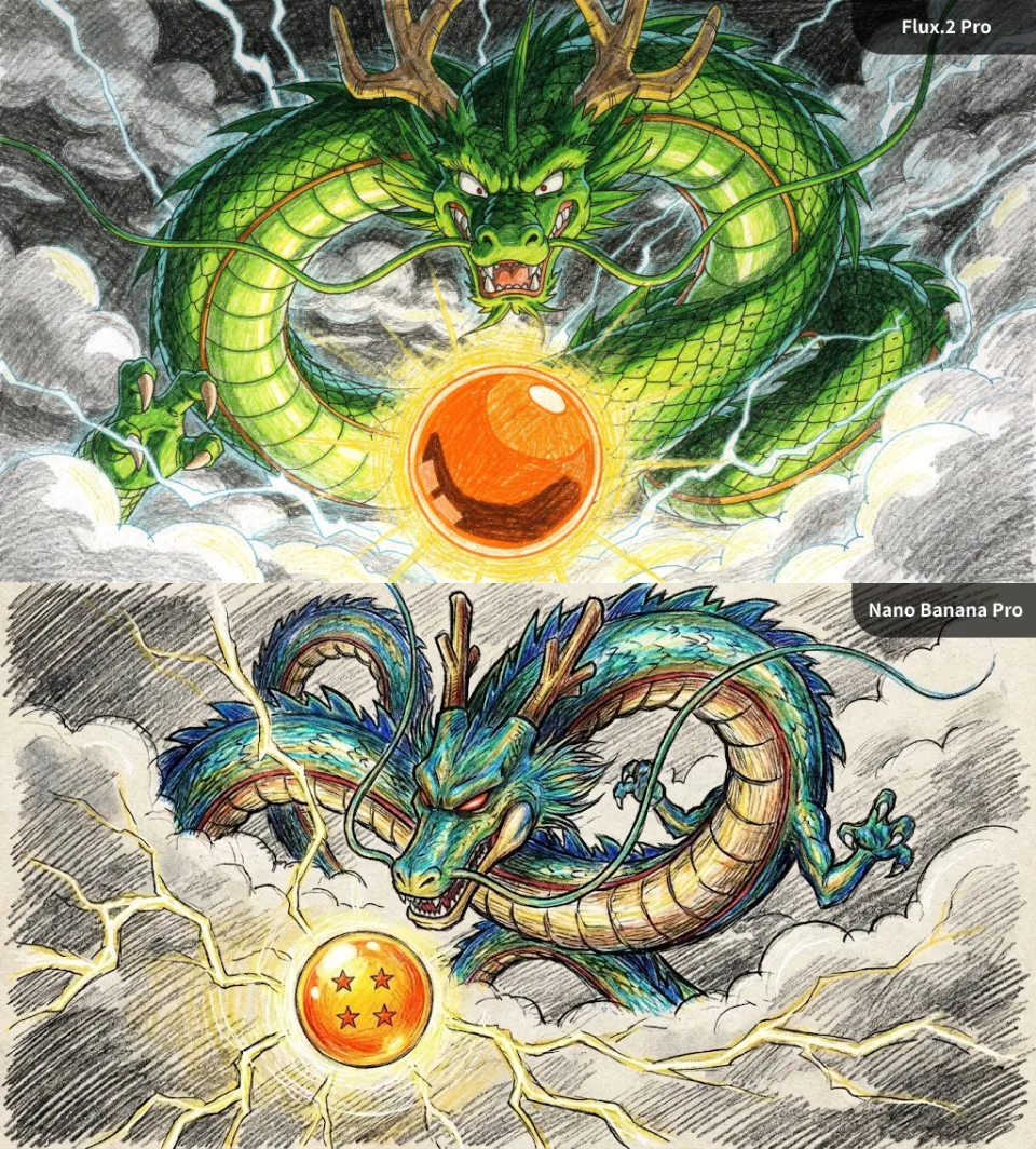 Prompt:《龙珠 Z》中的神龙正看着眼前的龙珠,以酷炫的彩色铅笔风格,动态多彩的画面,带电的阴影。