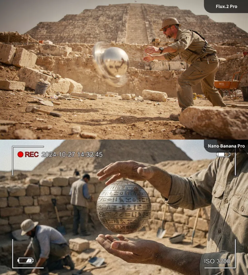 Prompt:人类考古学家在金字塔挖掘现场发现一个旋转金属球的真实手持拍摄,手持纪录片现实主义,真实手持风格。