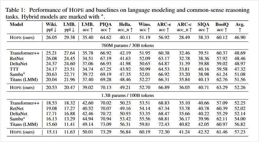 而在真正的评测里,论文作者拉来了Transformer++、RetNet、DeltaNet、Titans那些模型,在同样的参数量和训练数据下,HOPE在一串常见评测上,平均成绩都是第一档。