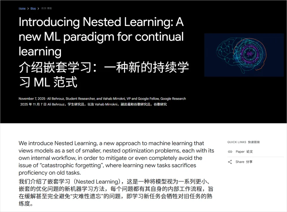 所以,《Nested Learning: The Illusion of Deep Learning Architectures》应运而生。