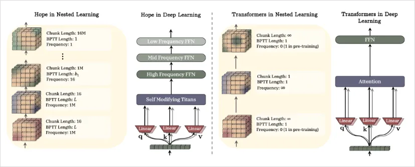 HOPE里面,混了两个东西,一部分是会自我修改权重的序列模型,一部分是多时间尺度的连续记忆带(Continuum Memory System)。