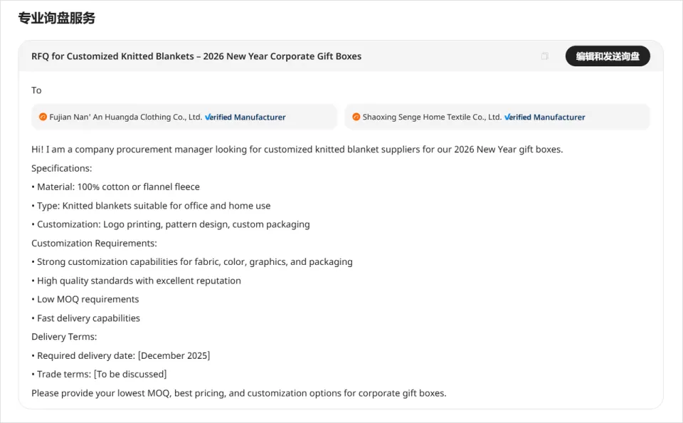 然后再帮我写询盘邮件,只需要我点击发送,就可以和商家沟通。