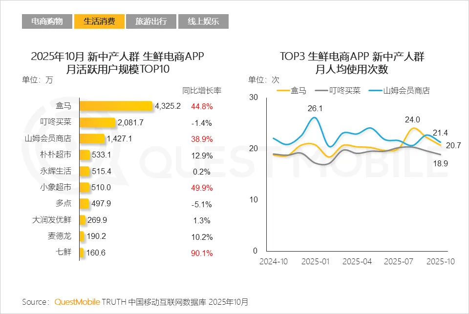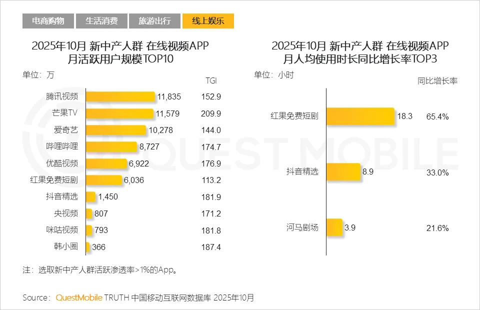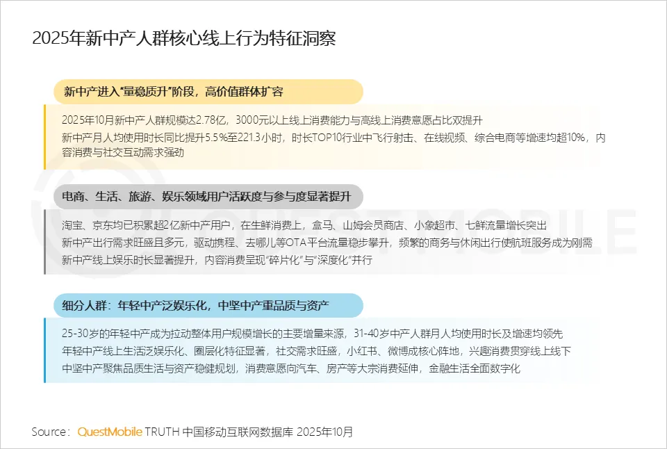 QuestMobile数据显示,2025年10月新中产人群用户规模达到2.78亿,同比净增长317.4万,全网占比微降0.2个百分点。