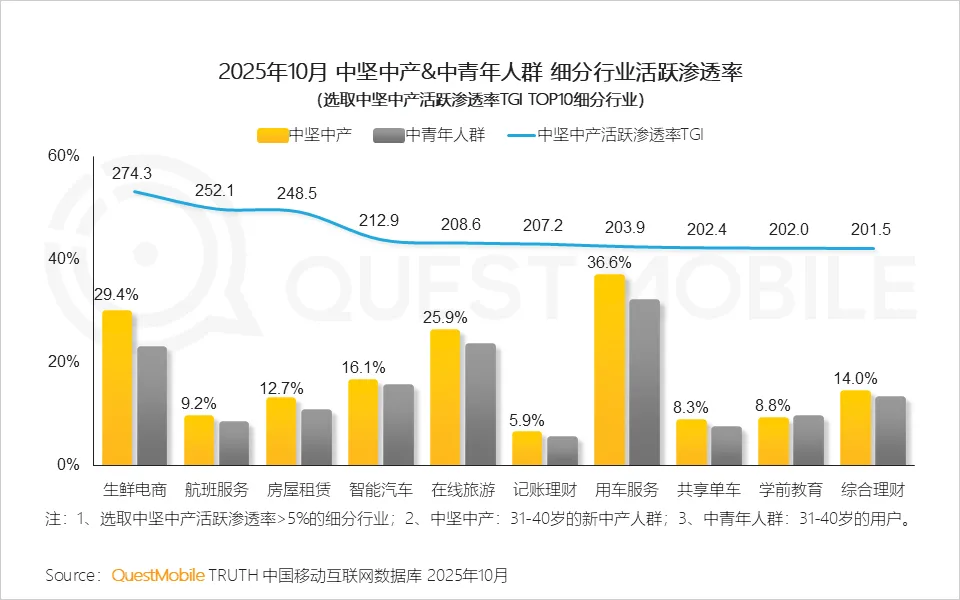 3、中坚中产聚焦品质生活与资产稳健规划,汽车、房产等大宗消费意愿凸显,对生鲜电商、旅游出行的需求远超同龄人