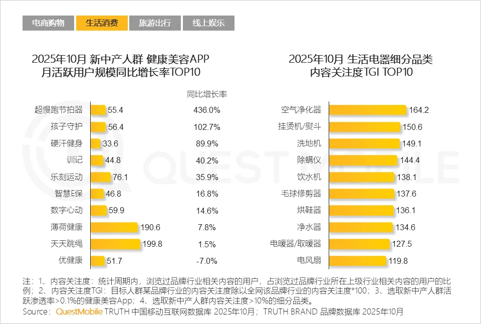 第三,休闲旅游新业态,以及AIGC、智能汽车、智能健康等新产品和服务的持续进化,则为新中产群体的消费需求释放提供了可靠路径。2025年10月,旅游攻略、AIGC、飞行射击(游戏)、智能健康、汽车社区占据了月活用户规模增长率TOP5的位置,同比增长分别达到420%、165.1%、48.1%、37.4%和36.7%!