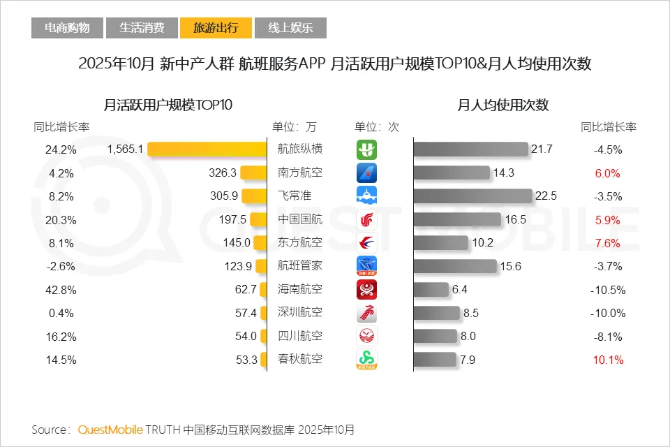 9、新中产商务与休闲出行频繁,航班服务平台成为高频刚需工具,南方航空、中国国航等航司APP使用次数提升