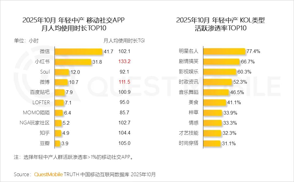 2、年轻中产线上生活泛娱乐化、圈层化特征显著,与同龄人相比,对社交平台的使用程度更深