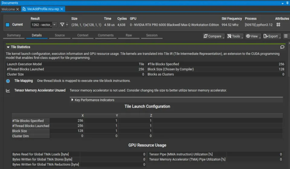 详情页新增「Tile Statistics」(Tile 统计)部分,总结 Tile 维度和重要管线(pipeline)的利用率。