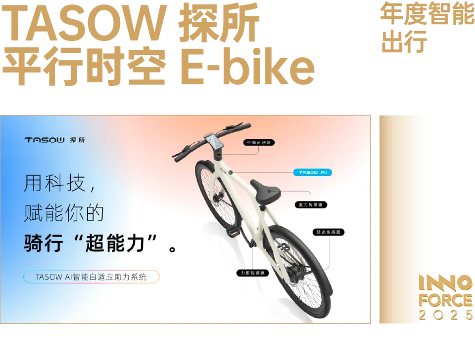 为了达到和自行车相近的骑行体验,探所「平行时空」将电池、电机等核心部件进行了一体化集成,同时使用了碳纤维材料,使得整车轻量化得到了有效控制,最长续航可达 100km。同时,TASOW AI 智能自适应助力系统,可以结合内置 4 大传感器,实时根据踏频、踩踏力度和坡度环境等,自动调整电机输出功率,实现「无感动力辅助」。