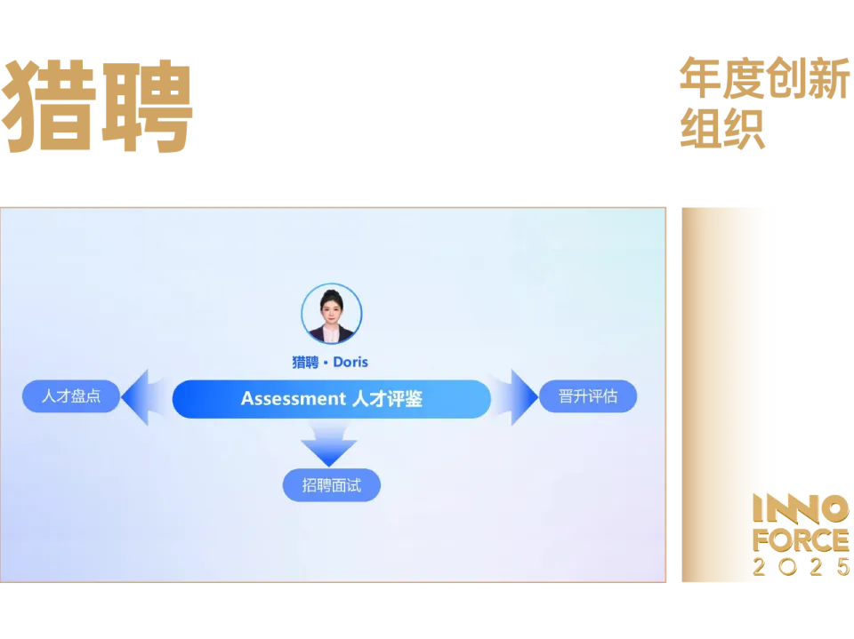 它的创新主要体现在两大层面:在技术应用上,它并非简单地将 AI 作为辅助工具,而是以 AI Agent 为核心,系统性地重构了从需求确认、人才寻访、意向沟通到深度评估的全链路招聘服务,推动招聘逻辑从「人工筛选+经验驱动」向「数据驱动+智能决策」的根本性转变。
