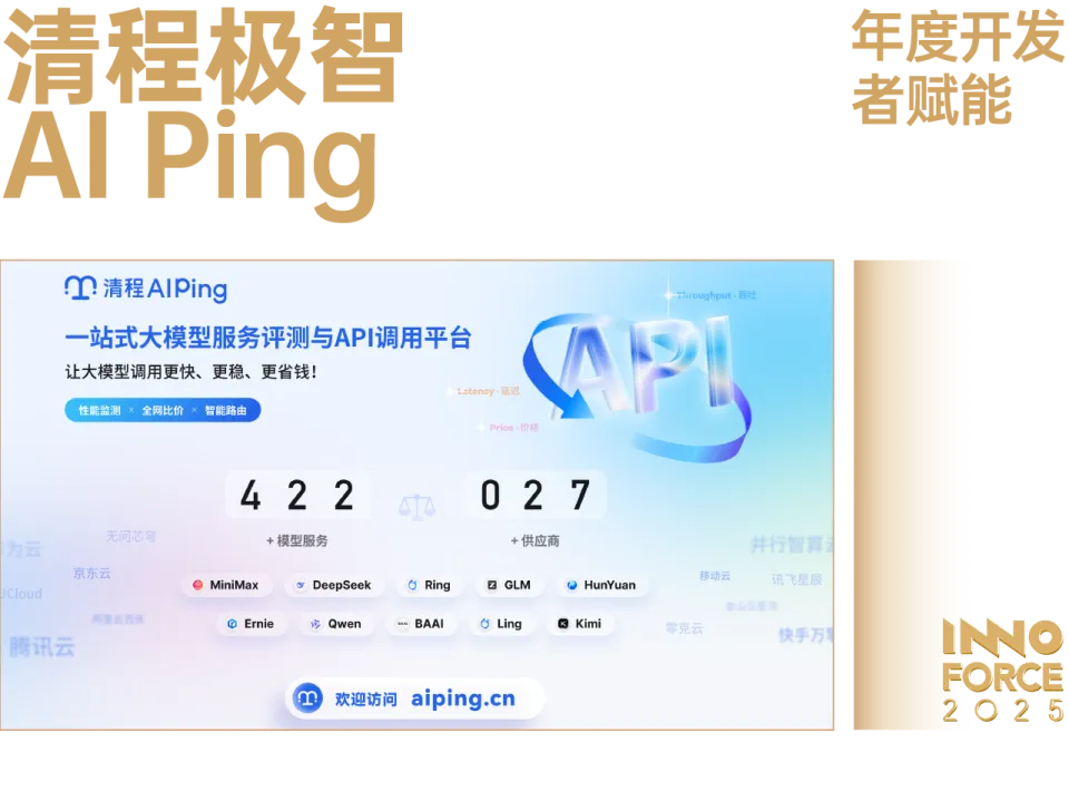 AI Ping 是清程极智旗下的大模型服务评测与一站式调用平台。2025 年,清程极智 AI Ping 已覆盖数十家大模型 API 服务商的数百个模型服务,监测延迟、吞吐、可靠性等关键指标,汇总价格、最大上下文长度和输入输出长度等关键信息,形成可验证的性能榜单。