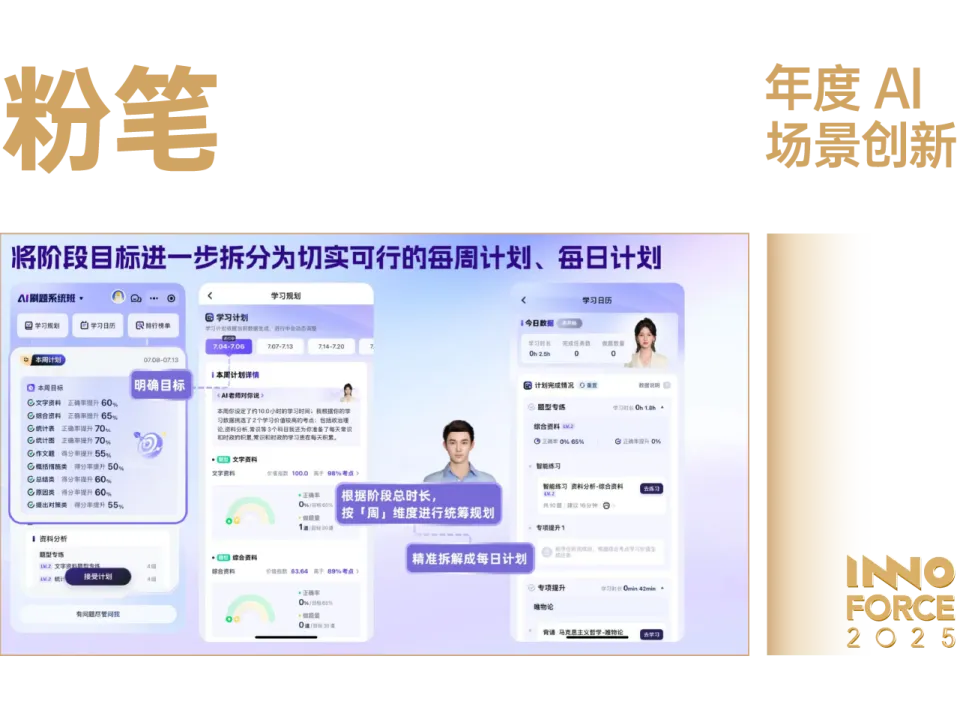 粉笔的突破不仅是单一的产品创新,更是对传统职业教育「千人一面」模式的深刻变革。它凭借在「垂域大模型」上的首创性探索,以及对「AI 产品矩阵」的快速布局,有力冲击了「名师资源稀缺、个性化辅导昂贵」的行业痛点,为数千万考生提供了更高效、更普惠的智能教育解决方案,很好地诠释了「AI 教育创新」的价值。