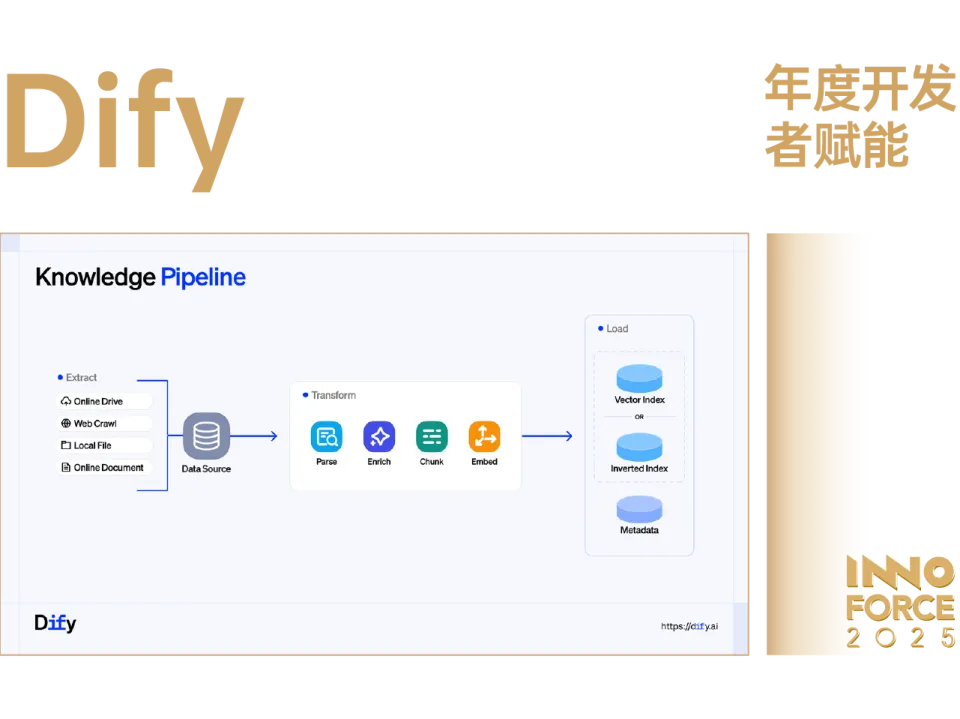 作为一款开源生成式 AI 应用开发平台,Dify 在 2025 年完成了两个关键升级:插件市场(Marketplace)的推出,让全球开发者能够像搭建积木一样自由组合与共享智能模块,推动了 AI 应用搭建的「组件化创新」;同时,全新的知识流水线(Knowledge Pipeline)重新定义了 RAG,让企业级知识管理进入可视化构建与高度自定义的新阶段。