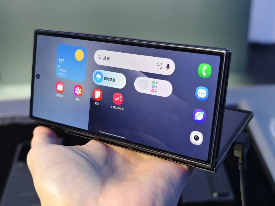 在扩展模式下,三折叠手机还能跟外接显示器组成双屏体验。我们可以在不同屏幕间拖拽应用,并以桌面方式在两个屏幕上工作,这一功能现场暂时没有体验到。