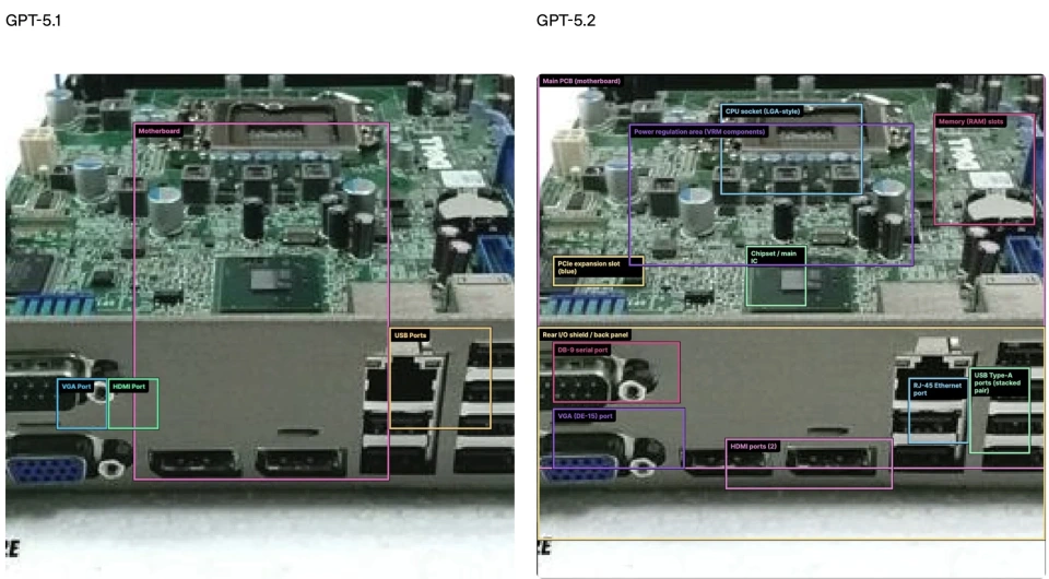 与之前的模型相比,GPT-5.2 Thinking在图像中元素的位置把握上更强,这有助于解决相对布局在问题中起关键作用的任务。在示例中,即使是低质量的图像,GPT-5.2也能识别出主要区域,并放置大致与每个组件真实位置相符的框,而GPT-5.1仅能标注少数几个部分,并且对它们的空间排列理解明显较弱。