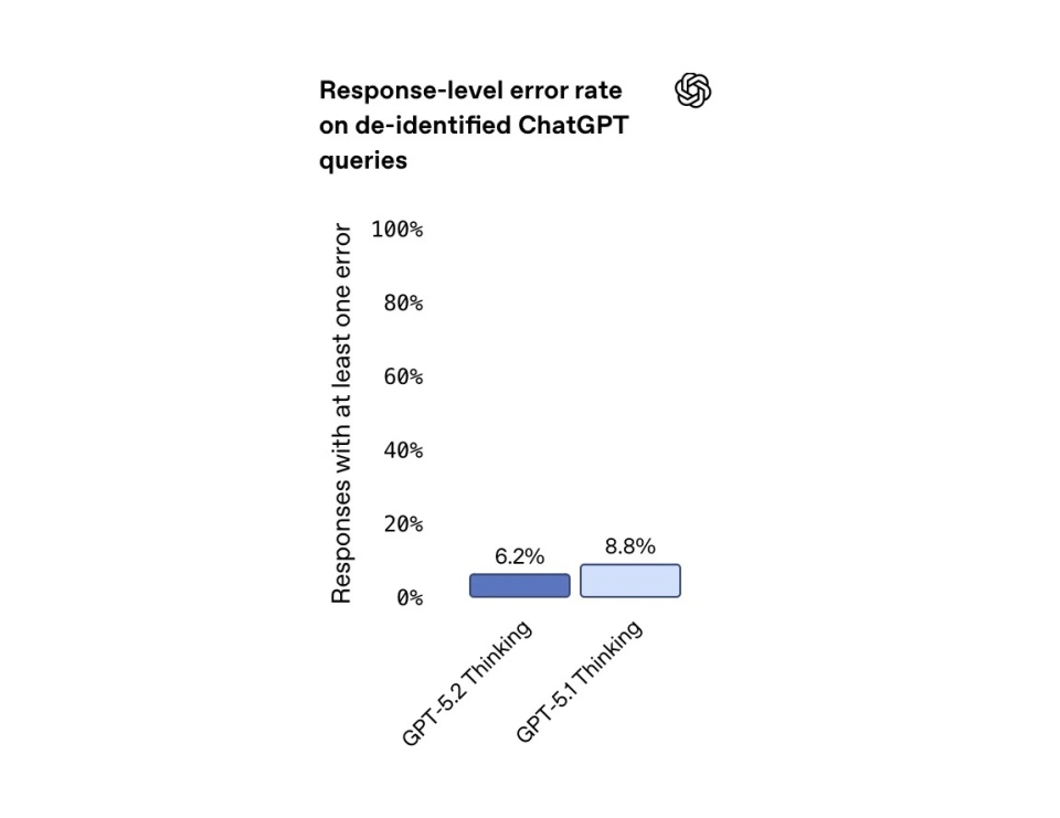 在事实性方面,GPT-5.2 Thinking在匿名真实查询集合上的错误率相较上一代下降约30%。OpenAI强调,GPT-5.2在面对模糊或信息不完整的查询时,会更主动给出依据来源或使用结构化推理路径,以降低误导性回答的概率。