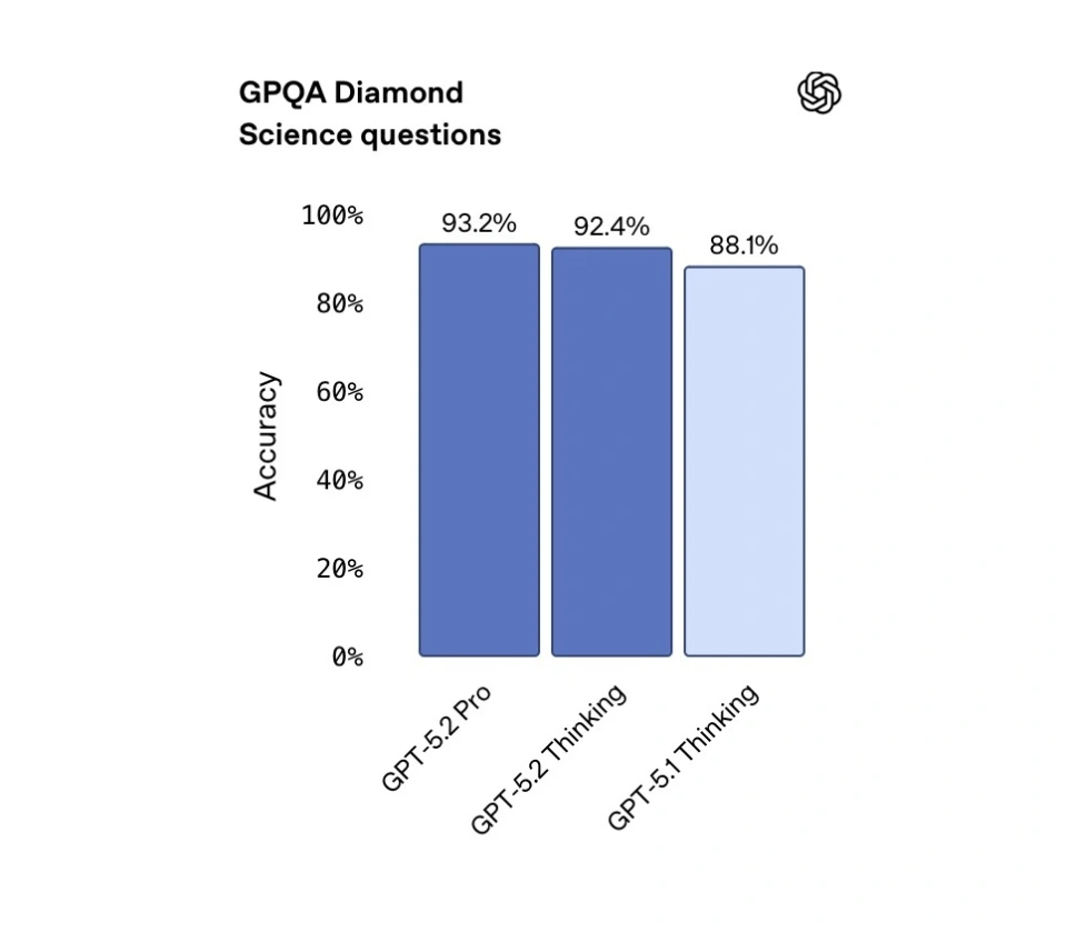 GPT-5.2 Pro在GPQA Diamond(研究生难度的大规模科学知识测试)中取得93.2%准确率,在现有同行测试中位居前列。