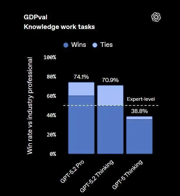 GPT-5.2 在 GDPval(知识工作)基准上的分数为 74.1%,OpenAI 声称这是 AI 模型首次达到了「人类专家水平」。