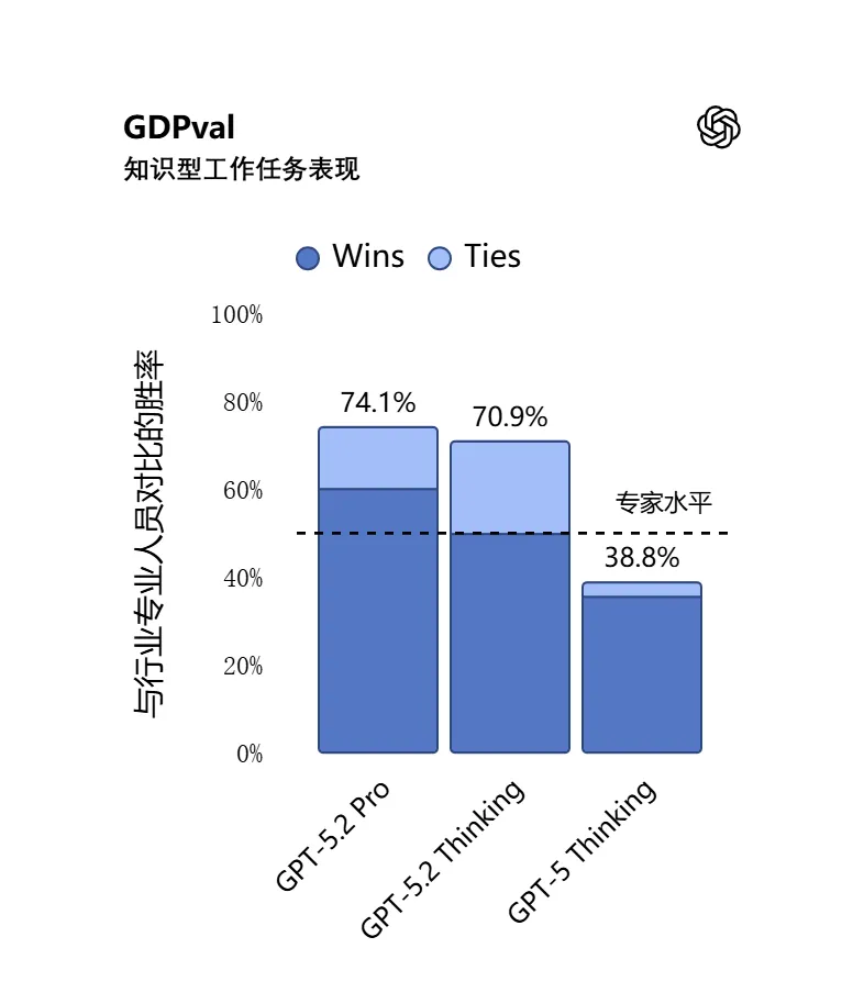 结果5.2成为首个达到或超过人类专家水平的模型。根据人类专家评审的结果,5.2 Thinking 在 GDPval 的知识型任务中,有 70.9% 的项目表现优于顶尖行业专业人士或持平。这些任务包括那些白领打工基本技能,如制作演示文稿、电子表格以及其他活儿。5.2 Thinking 的输出速度在 GDPval 任务中比专家快 11 倍以上,成本却不到其 1%。这表明,在有人类监督的情况下,GPT‑5.2 能有效辅助专业工作。