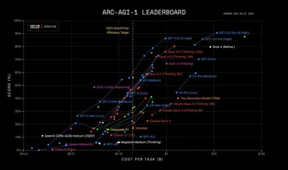 但我们也不得不服前沿大模型的学霸级考试水平。ARC-AGI也在第一时间发布了测试结果。5.2的准确率高达 90.5%,每个任务的成本仅为 11.64 美元,一年内效率提升了约 390 倍。回顾过去 12 个月,在 ARC-AGI 测试中,任何超过 85% 的准确率都需要近乎疯狂的计算资源。早期对 o3-preview 的估算显示,每个任务的成本在 3000 美元到 3 万美元之间。基本上,每次想要得到一个答案,你消耗的算力成本相当于一辆汽车。现在GPT-5.2 Pro 登场,取得了 90.5% 的准确率,而价格却只相当于几杯咖啡。已经相当接近人类95%的水平了。
