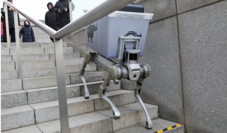现场,「汪汪队」的宇树机器人在面对一个超高难度陡坡,充分展现了其卓越的四足平衡能力。