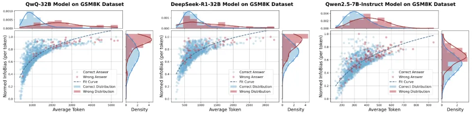 在 GSM8K 数据集上的实验清晰地展示了这一规律:错误答案往往伴随更长的推理链和更高的 InfoBias。越是错误的答案,模型往往输出更多的 token。