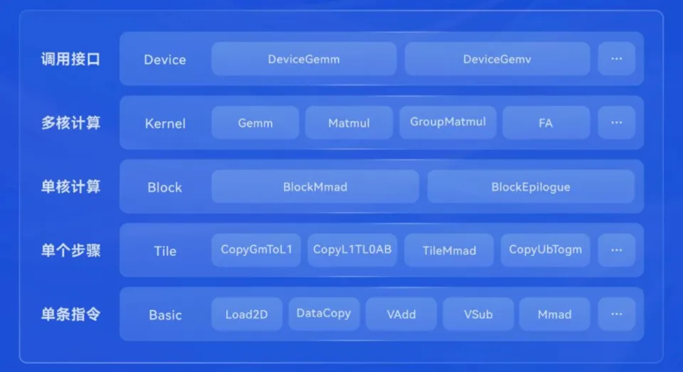 这是一个基于 Ascend C 构建的高性能算子模版库,它将复杂的矩阵乘法及其融合算子抽象为可配置的模板。开发者无需重新编写复杂的切分(Tiling)和流水线(Pipeline)逻辑,只需简单的参数配置,即可快速生成适配不同形状和精度的矩阵乘算子。