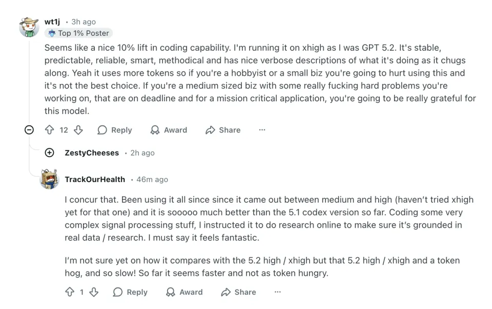 在 Reddit 上,有用户称相比此前使用的 GPT-5.2,新模型在编码能力上体感大约有一成左右的提升。他目前将模型运行在较高配置下,整体感受是表现稳定、可预测性强,执行过程可靠且逻辑清晰,在完成任务的同时还会对推理和操作步骤给出较为详尽的说明。