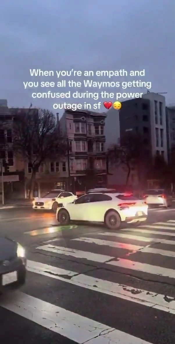 在此期间,有大量照片和视频被发布到社交媒体上,拍下了 Waymo 自动驾驶出租车在道路中间和十字路口停车。也说明了这一瘫痪现象并非个例,而是普遍现象。