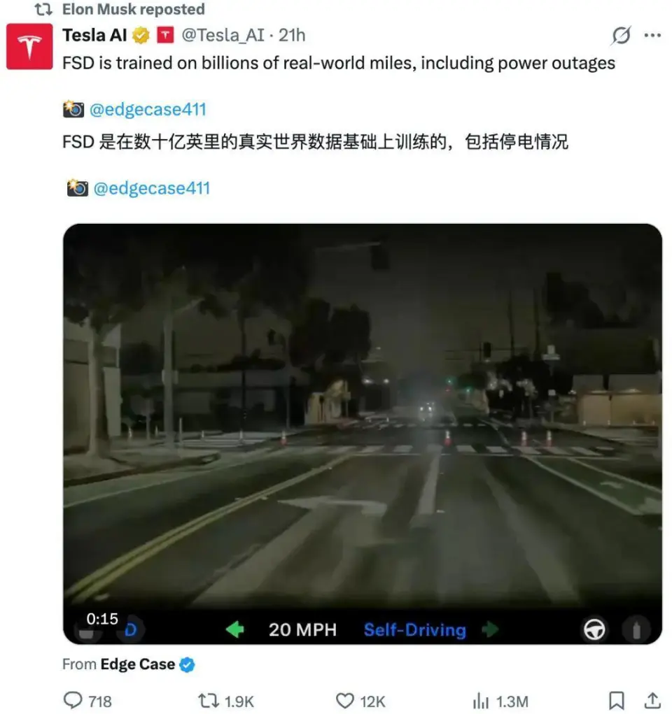 反观 Waymo 的强力竞争对手,自动驾驶界的老玩家特斯拉却完全没有受到大规模停电的影响,开启 FSD 的特斯拉汽车在大停电期间依然正常行驶。