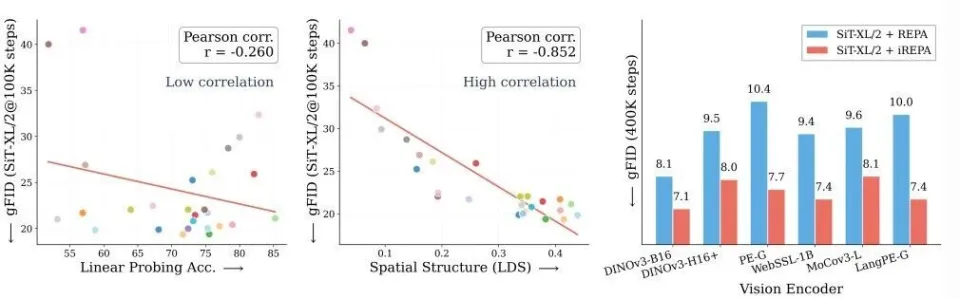 分类能力与生成质量几乎无关,空间结构却高度相关。左:线性探测准确率与生成 gFID 的相关性极弱(Pearson r=-0.26)。中:空间结构指标(LDS)与生成质量呈现出显著强相关(Pearson r=-0.85)。右:基于空间结构改进的iREPA,在多种编码器上稳定优于REPA。