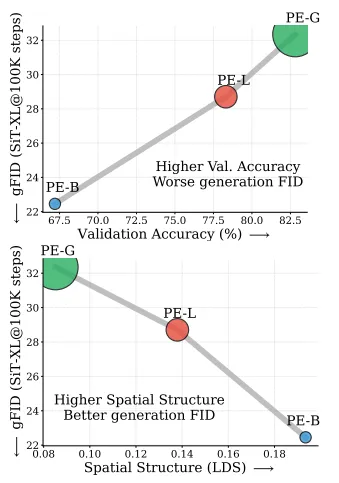 PE-G和WebSSL-1B在ImageNet上具有更高的分类准确率,但它们的空间自相似性显示,前景与背景被过度拉近,边界模糊。相比之下,空间结构更清晰的SpatialPE-B,生成质量显著更好。