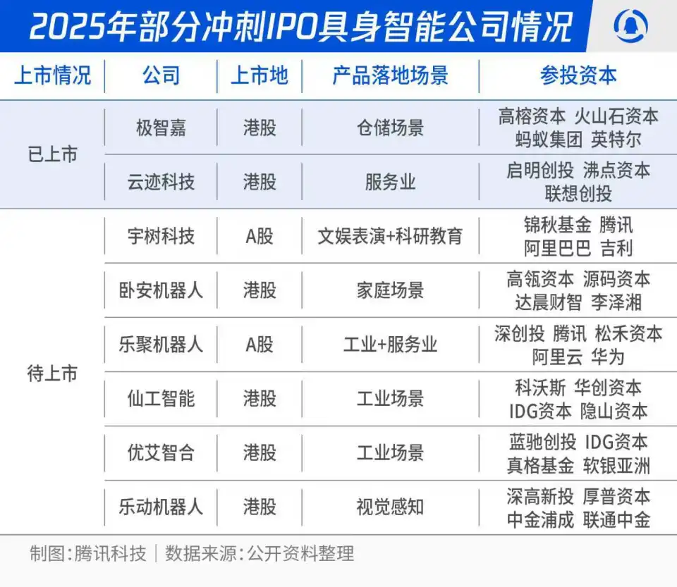 十余家企业扎堆递交IPO申请。极智嘉、云迹科技已成功登陆港股,宇树科技有望成为A股"人形机器人第一股",智元机器人通过收购上纬新材获得上市平台并完成管理层更迭。乐聚机器人、银河通用、云深处等头部玩家也在加速推进上市进程。