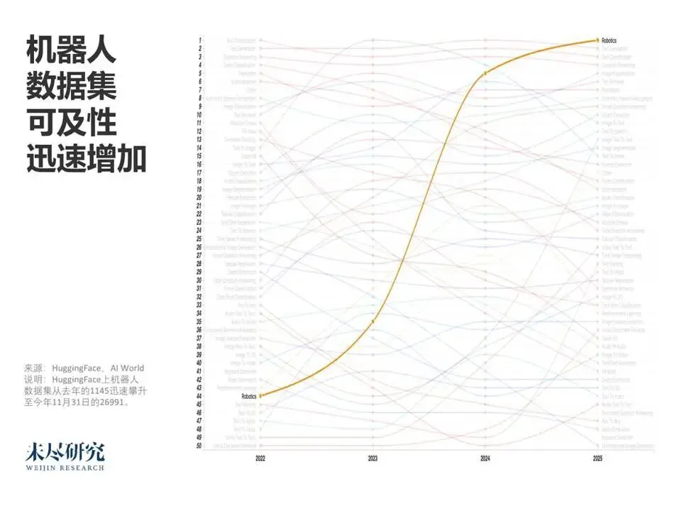 机器人相关数据集已是HuggingFace上迄今为止增长最快的,仅用3年时间就从第44名上升到第1名。然而,跨越鸿沟,具身智能领域还需要自己的ScaleAI与ARC-AGI。在数据真正得以“精炼”之前,中国同样难言产业场景优势。