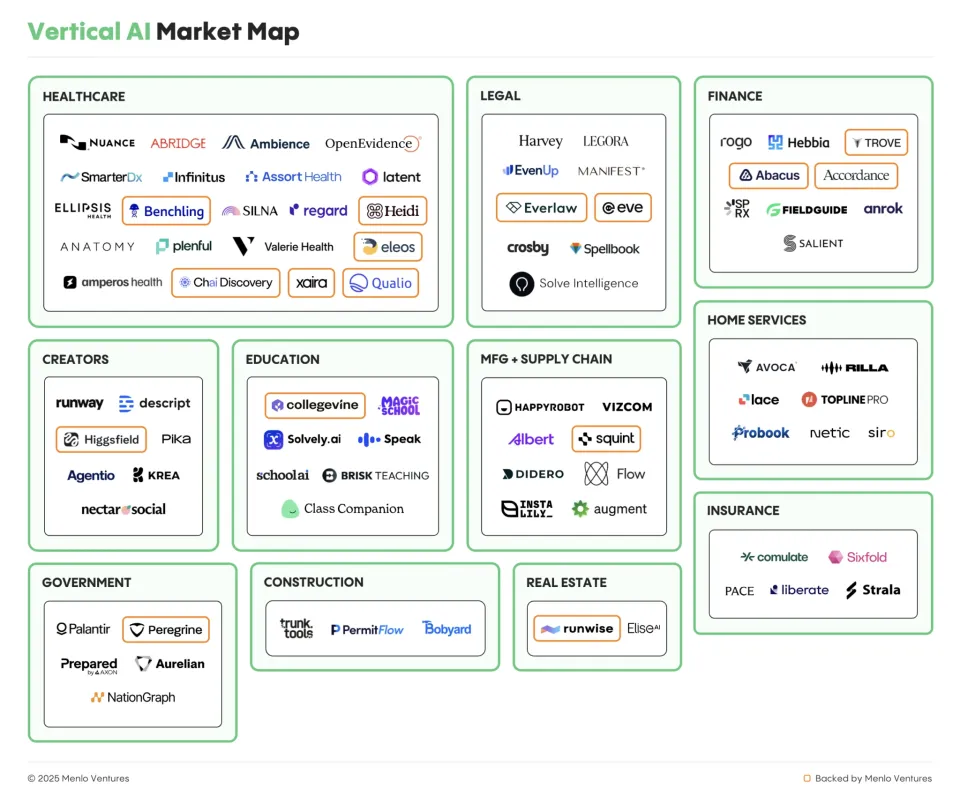 下方的市场图谱展示了在这些领域中布局的代表性公司,它们正在争夺今年企业投入到 Vertical AI 的 35 亿美元资金中的一部分。