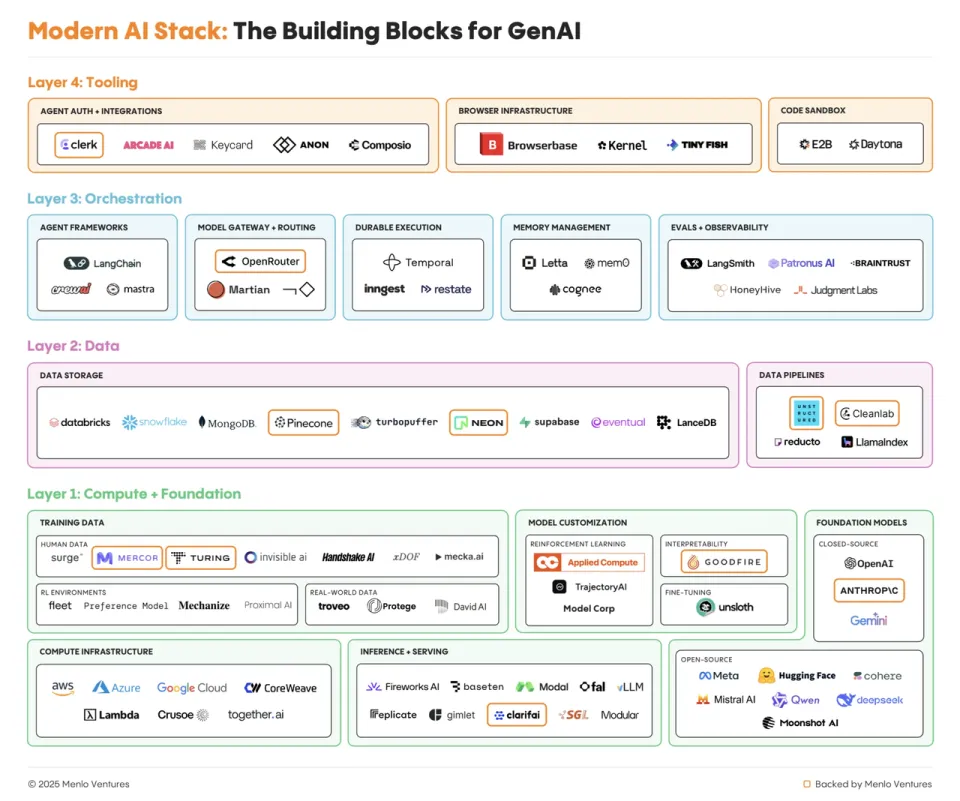 由于基于 LLM 的应用架构仍在逐步演进,现代 AI 技术栈在整体形态上与去年大体相似。到目前为止,最大的受益者是那些基于企业长期信任的数据与 infra 平台来持续扩展 AI 能力的传统巨头,包括 Databricks、Snowflake、MongoDB 和 Datadog。