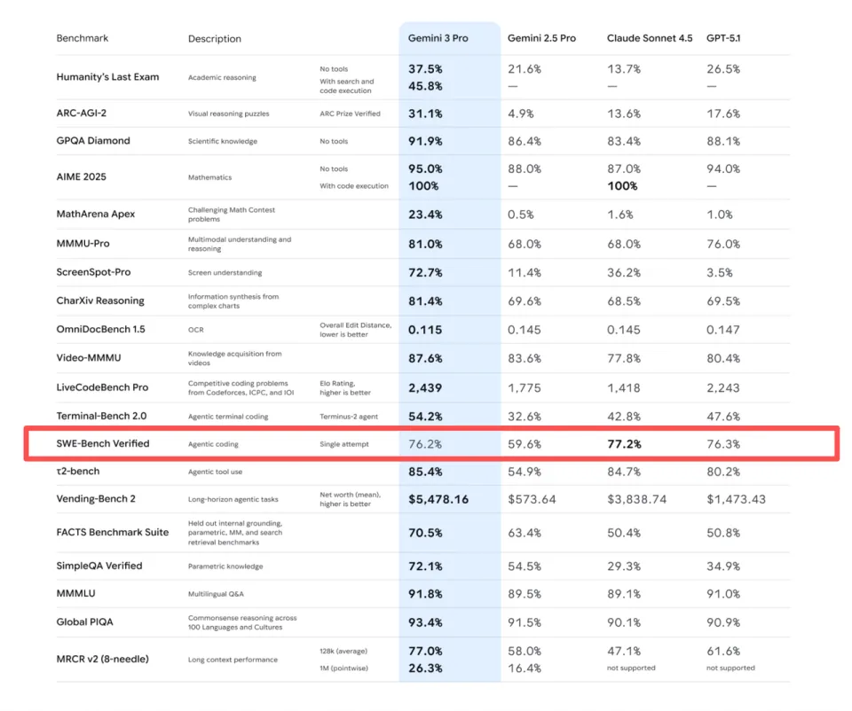 事实上,自 2024 年 6 月推出 Claude Sonnet 3.5 以来,Anthropic 在编程领域的 LLM 排行榜上已连续领先近 18 个月,几乎无人能及。当 Google 在 2025 年 11 月中旬发布 Gemini 3 Pro 时,Model Card 显示 Gemini 3 Pro 在大多数主要评估指标中处于领先,但唯独在 SWE-bench Verified(一项衡量真实软件工程能力的基准测试)上依然落后于 Claude Sonnet 4.5。