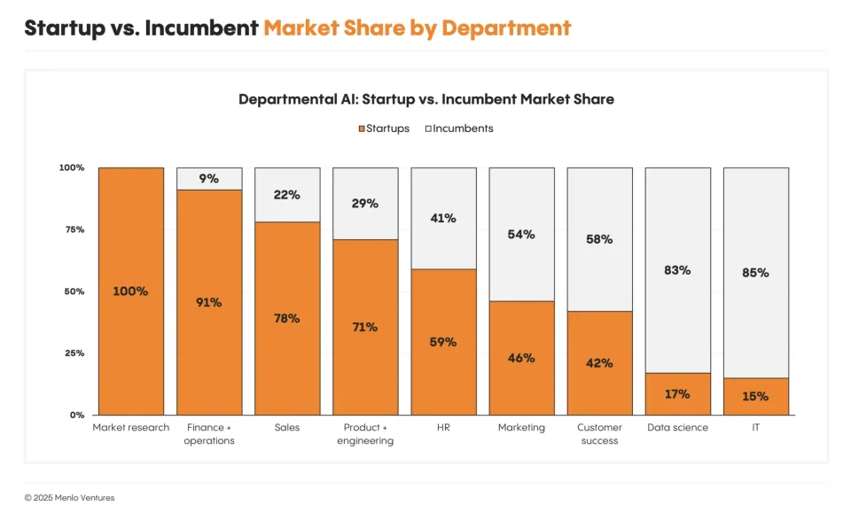 AI 初创公司在市场调研、销售、营销和产品等部门表现活跃。而传统巨头则在 IT 和数据科学领域稳守阵地,在这些领域,可靠性和深度集成的重要性超过了迭代速度。