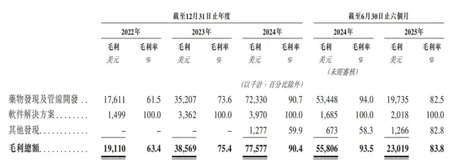 2022年、2023年、2024年、2025年上半年,英矽智能的毛利率分别为63.4%、75.4%、90.4%、83.8%,毛利率稳步增长主要是受到管线药物收入以及对外授权交易里程碑付款的影响。